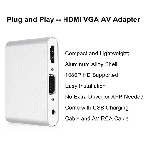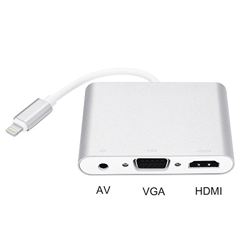 Compared with other lightning to HDMI VGA audio adapters, this Bambud adapter has another AV port, ideal for your old device with AV port; in addition, it supports video output simultaneously to three display devices with HDMI, VGA or AV port, besides, the AV port can also be used as a audio output (3.5mm port) for the VGA devices