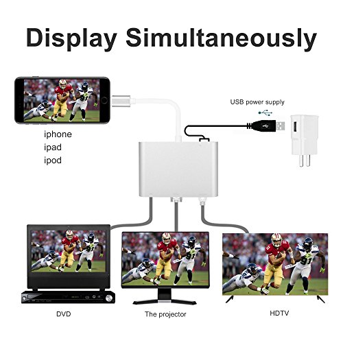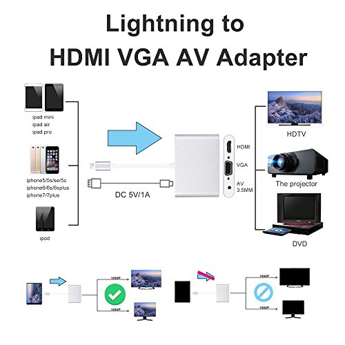 This iPhone to HDMI VGA audio adapter supports mirroring of what is displayed on your lightning device (Including apps, website, presentations, slide shows, movies, games, pics, etc) to your HDMI, VGA or AV equipped devices ( like TV / projector/moniter,etc) to enjoy the larger and clearer screen up to 1080p HD.
