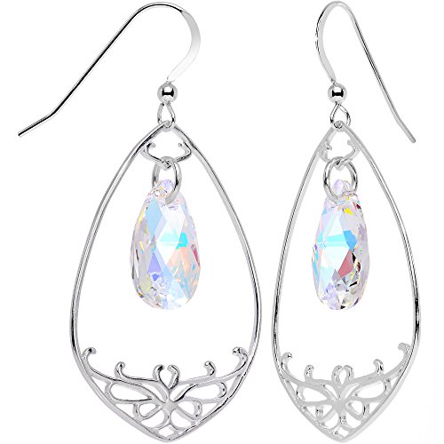 Upgrade your current look with this pair of fashionable handcrafted dangle earrings for women created with Swarovski crystals. The entire earring is made of .925 sterling silver and includes fishhook earwire backings for securing the jewelry in your pierced ear lobes. These 2" length earrings feature a dangling design of a intricately detailed teardrop-shaped frame charm that holds within its center a suspended aurora crystal teardrop. Specifications: 2" (50mm) Length, .925 Sterling Silver, Fish Hook Earwire Backings, Created with Swarovski Crystals, Hand Assembled in the USAFeature