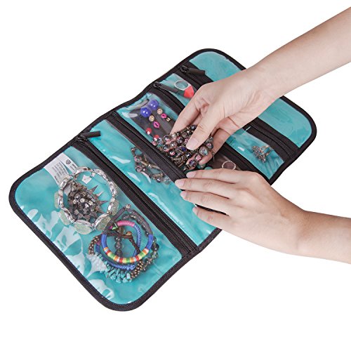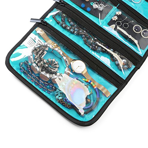 BAGSMART Hanging Travel Jewelry Roll Bag with Zippered Compartments for Earrings & Necklaces & Ring, Blue