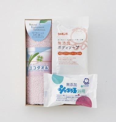 | セット内容 | エコロジーハンドタオル(約280×320mm) シャボン玉無添加石けん(約30g) シャボン玉無添加ボディーソープ(約15ml) |