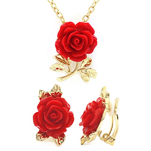 Made of base metal alloy, this jewelry set includes Rose pendant necklace and matching Clip on earrings. Featuring a lovely bright red rose made of resin and is accented with several rose gold plated leaves. Earrings come with clip on backings while pendant comes with adjustable 18-inch chain. This lovely set will make the perfect choice for your special someone for Valentine's gift, Christmas gift, Mothers day gift, Birthday gift, Anniversary Gift, or Bridal party gifts.Feature