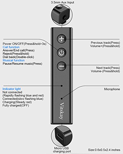 Studio : Lanne Publisher : Lanne Binding : Electronics Product Description Vitskay Bluetooth Receiver,Hands-Free Car Kits Wireless Music Adapter with Bluetooth 4.2 for Headsets/Earbuds/Car Audio/Speaker/Home Stereo Professionals know it more professional!This is a device,which make your life wireless everywhere,connected to home audio system, then it becomes to a Bluetooth audio and plays music from cellphone.Turn your non-bluetooth Car Stereo/earphone into a Bluetoothenabled one.Support hands-free calling for safe driving.It's amazing to fill Your Life With Wireless music. *Specification: Bluetooth Version:V4.2 EDR Bluetooth protocol:HFP/HSP/A2DP/AVRCP Input:5V 1A Charging Port:Micro USB Product Weight:1.5 ounces Product Size:2.4"*0.6"*0.5" inch (L*W*H) Play Time:4hours Charging Time:2hours Working Distance:33 fts *Packing Details: - 1 x Bluetooth Receiver - 1 x Charging Cable - 1 x 3.5mm to 3.5mm male plug - 1x 3.5mm audio Cable - 1 x User Manual * Warm Tips: 1.If you can not turn on the product for the first time, maybe the battery is low, please try again after fully charged. 2.Do not put the receiver in high temperature that is above 45℃ or exposed to sunshine, as it will influence service life. 3.It may result in damage to the receiver if the input voltage is too high,follow the instructions. * Warranty: We will provide 7/24 Online Customer Service. 12 Months Warranty and 30 days full refund guarantee from the date of original purchase. No question asked.