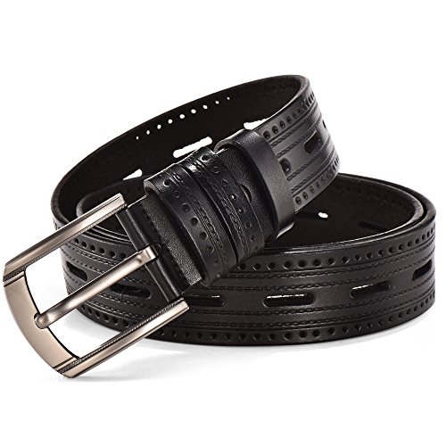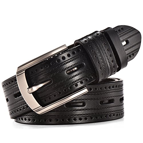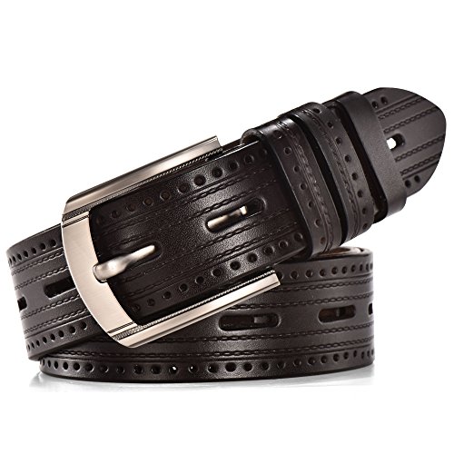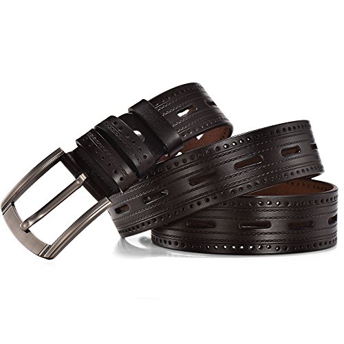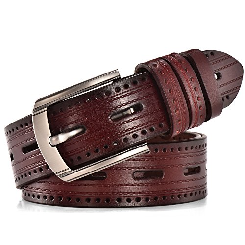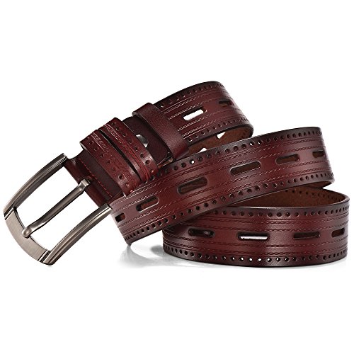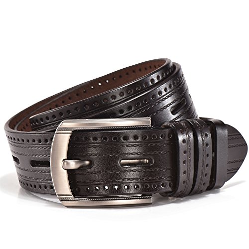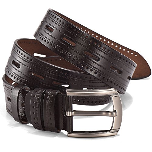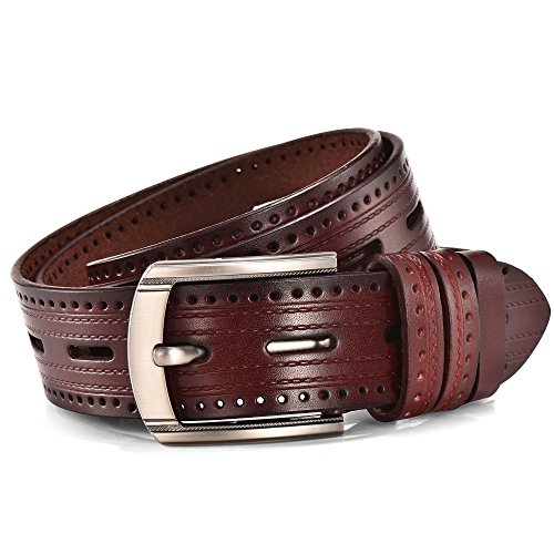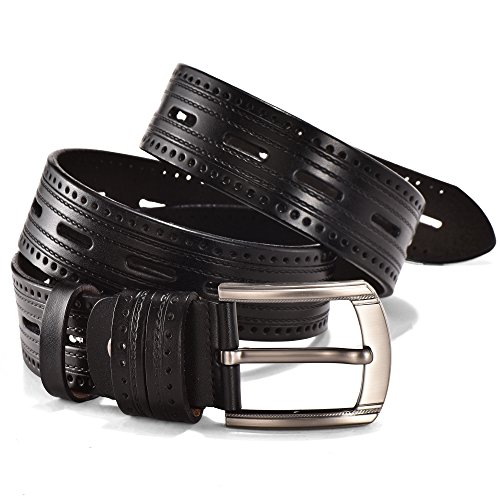 -. Feature : 100% Genuine Leather Cowhide / Trim to fit. All belts could be adjusted, just don't worry about the size. We will send you a hole puncher in every orders / 1.5"(38mm) Wide available in 3 colors and suitable for size 28-42 waist / Black, brown and red-brown belt, single prong buckle with stirrup buckle are made with zinc alloy to create a substance with greater strength and durability / New fashion design, high quality leather flat big holes with two row small dots on the whole belt body, and also keep classic and vintage features. Suitable for any occasion whatever work, business and leisure or fashion and casual wear