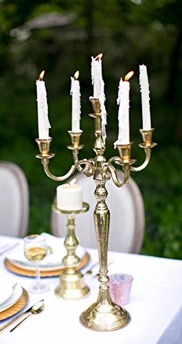 Studio : Quick Candles Publisher : Quick Candles Binding : Kitchen Product Description If you're looking to add some regal flair to your table, this gold Moretti candelabra is the perfect piece. Use in centerpiece arrangements or as an opulent home decor accent. The four arms hold taper candles, and the top can be assembled either with another taper candle cup or with a dish for pillar candles. The candelabra measures 25" tall and 14" wide. With the taper holder this candelabra measures 25" tall, with the pillar candle holder it is 24.5" tall. Minor, tool-free assembly is required and instructions are included. 0