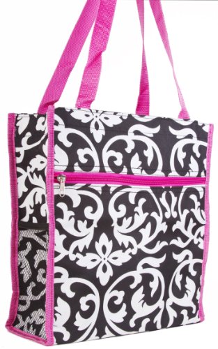 -. Binding : Apparel -. Brand : LD Bags -. Color : Damask Hot Pink Trim -. Department : womens -. Feature : Deep Zippered Outside Pouch For Extra Items / Zipper and Velcro Close / Attached Coin Purse / Netted Side Pocket for Cell Phone or Water Bottle / Folds Flat -. PackageQuantity : 1 -. ProductGroup : Apparel -. ProductTypeName : BAG -. Title : Damask Tote Hot Pink Trim