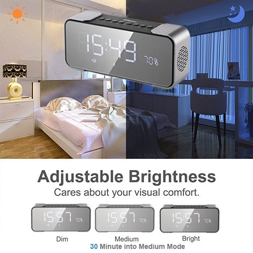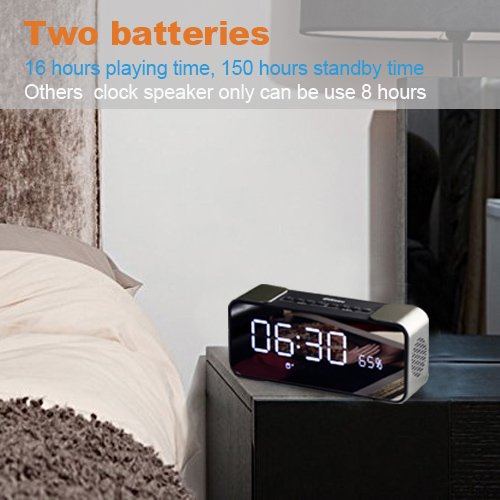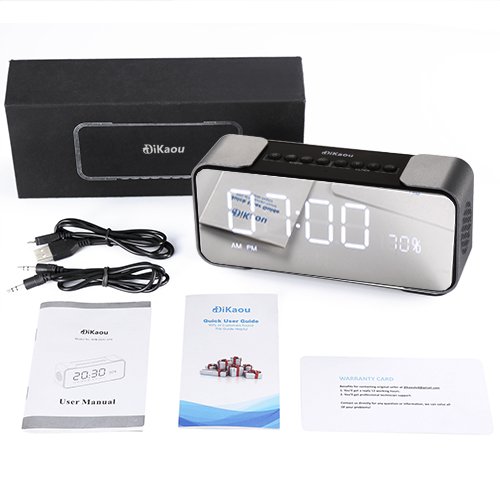 Why choose DIKAOU LED Bluetooth Speaker Bedroom Alarm Clock ? Long battery life The speaker has a 4400mAh built-in battery for up to 16 hours play time. Large Screen Display The multifunctional bluetooth speaker with alarm clock comes with a compact design and large display panel which can be read clearly at anytime as a nightstand clock. Premium Stereo Sound Our digital alarm clock provides superior listening experience in clear and exquisite sound. Immerse in such premium tone quality that's crafted for your total enjoyment. Brand Name: DIKAOU Power Supply: 5V / 1A Speaker Output Power: 2 X5W Built-in Battery: 7.4V / 4400mAh Bluetooth Version:V4.2 Charging Time: 3--5 hours Music Play Time: 16 hours Standby Time: 150 hours Package Include: 1 xDIKAOU Wireless Bluetooth Speaker 1 x Charging Cable 1 x User Manual of English