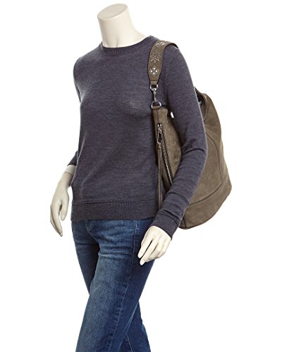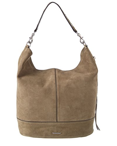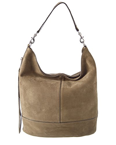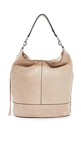 An understated Rebecca Minkoff hobo bag in soft nubuck. A zip pocket opens at the side. Magnetic top and lined, 3-pocket interior. Optional sling strap.