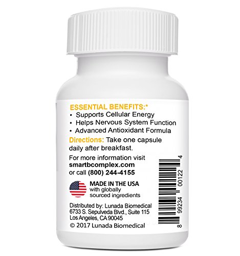 -. Binding : Health and Beauty -. Brand : Smart B Complex -. EAN : 0899234001224 -. Feature : Fights oxidative stress / Supports cellular energy production / Promotes nervous system health / Advanced antioxidant formula -. IsAdultProduct : 0 -. Label : Lunada Biomedical - Official Manufacturer -. LegalDisclaimer : Do not use if pregnant/nursing or under 18 years of age -. Manufacturer : Lunada Biomedical - Official Manufacturer -. MPN : 899234001224 -. PackageQuantity : 1 -. PartNumber : 899234001224 -. ProductGroup : Health and Beauty -. ProductTypeName : HEALTH_PERSONAL_CARE -. Publisher : Lunada Biomedical - Official Manufacturer -. Size : 30-Day Supply -. Studio : Lunada Biomedical - Official Manufacturer -. Title : Smart B-Complex - Oxidative Stress Relief Formula -. UPC : 899234001224