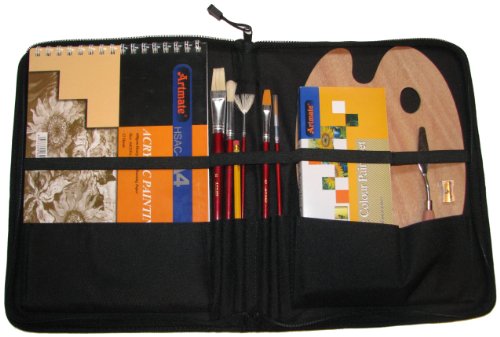 This Acrylic Media Art Kit includes a variety of art materials to motivate any artist to paint and conveniently transport their materials. Includes 12 sheet pad, 12 each 12-ml Acrylic Color, 5 each brushes for various uses, palette knife, pencil for sketch, sharpener, and wooden palette all transportable in a 10-inch by 12-inch zip canvas carry case.