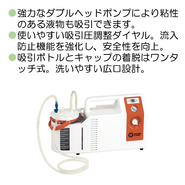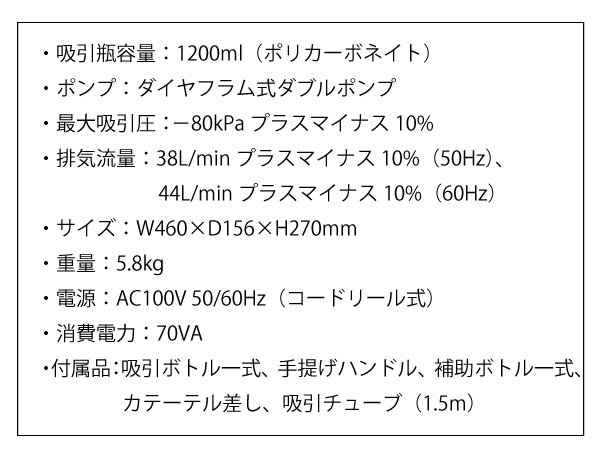 ●付属品:吸引ボトル一式、手提げハンドル、補助ボトル一式、カテーテル差し、吸引チューブ(1.5m)