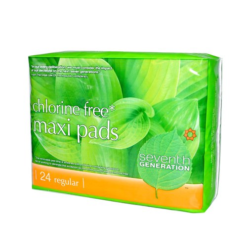 Studio : Seventh Generation Publisher : Seventh Generation Binding : Health and Beauty Product Description Seventh Generation Chlorine Free Maxi Pads Regular Description: Safe, Reliable, Comfortable Protection Now You Can Get the Absorbency and Comfort You Want in a Maxi Pad that's Totally Chlorine Free! Features and Benefits -- Whitened without chlorine - no residues from chlorinated hydrocarbons, including dioxin -- Absorbent pulp is Totally Chlorine Free -- Safer for sensitive skin - free of irritating dyes or fragrances -- Secure, no-slip adhesive provides security -- Individually wrapped - clean, discreet, and practical -- Contoured pad curves for a comfortable fit -- Cottony soft cloth-like cover -- Packaged in recyclable polyethylene. You Are Making a Difference Your choice of our chlorine free ultra-thin pads helps reduce the amount of chlorinated toxins, including dioxin, polluting our air, water, and soil, and helps make the world a safer, healthier place for your family and generations to come. Free Of Chlorine. Disclaimer These statements have not been evaluated by the FDA. These products are not intended to diagnose, treat, cure, or prevent any disease.