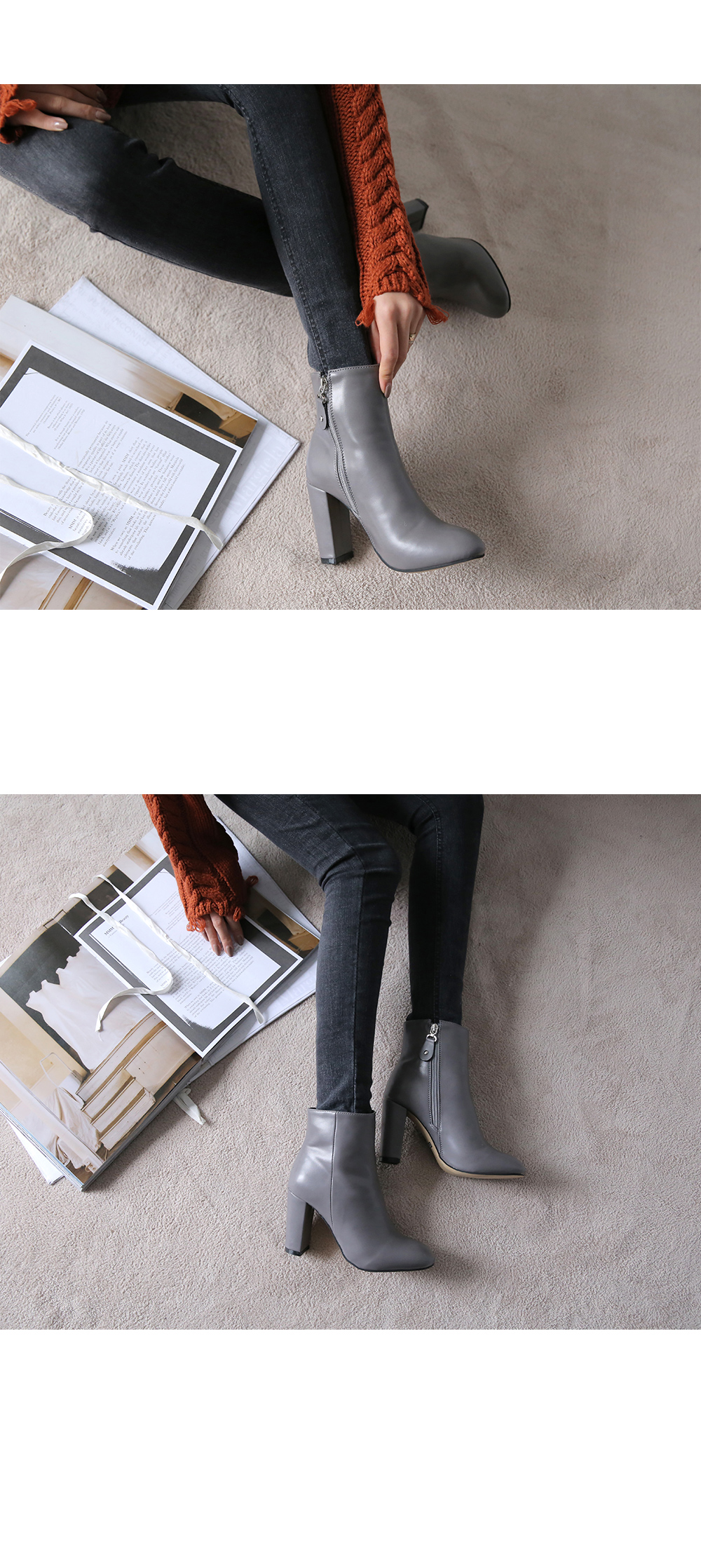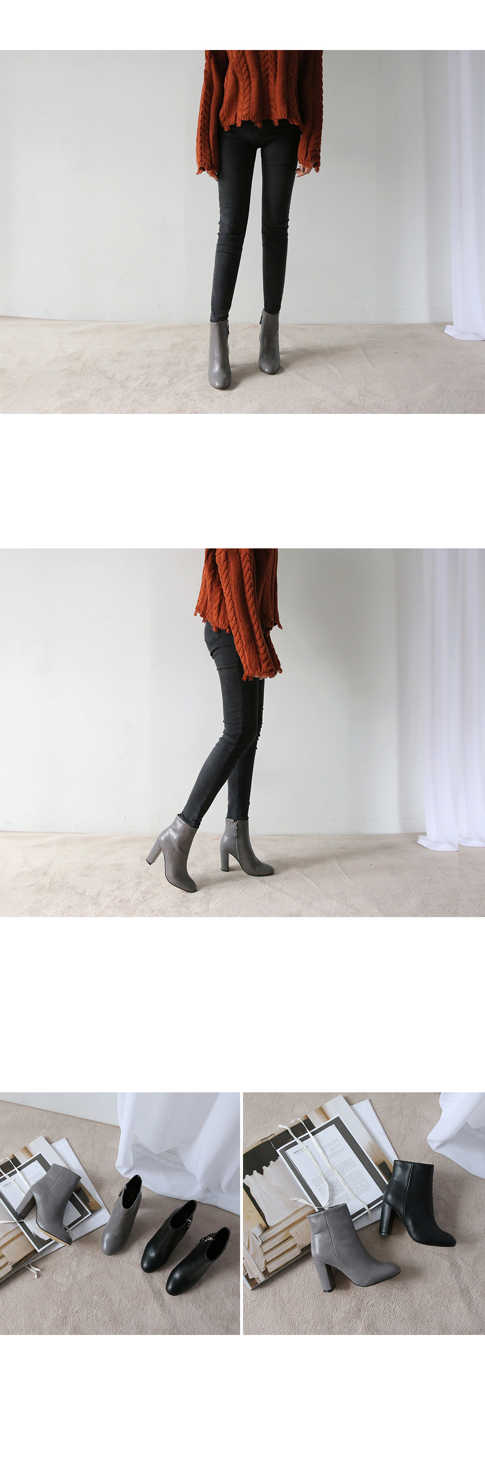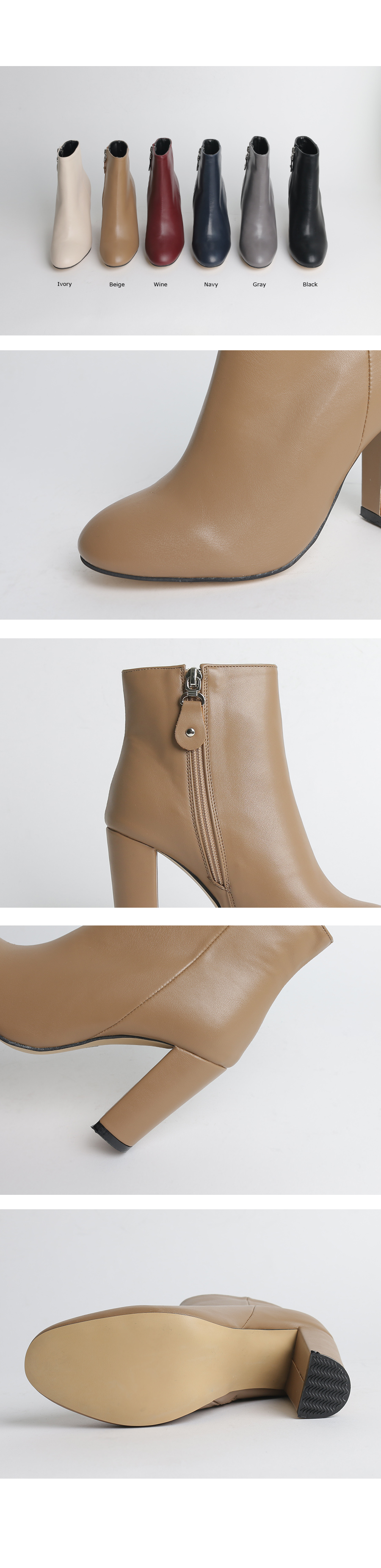 9cm하이힐 굽으로 다리라인은 날씬하고 길게 보여주구요 인사이즈 지퍼디테일로 겉에서 보여지는 디자인이 깔끔하답니다 지금시즌부터 자주 찾게되실거에요 외출하실때 슈즈 고민없이 툭 신어주세요 추천드릴게요!