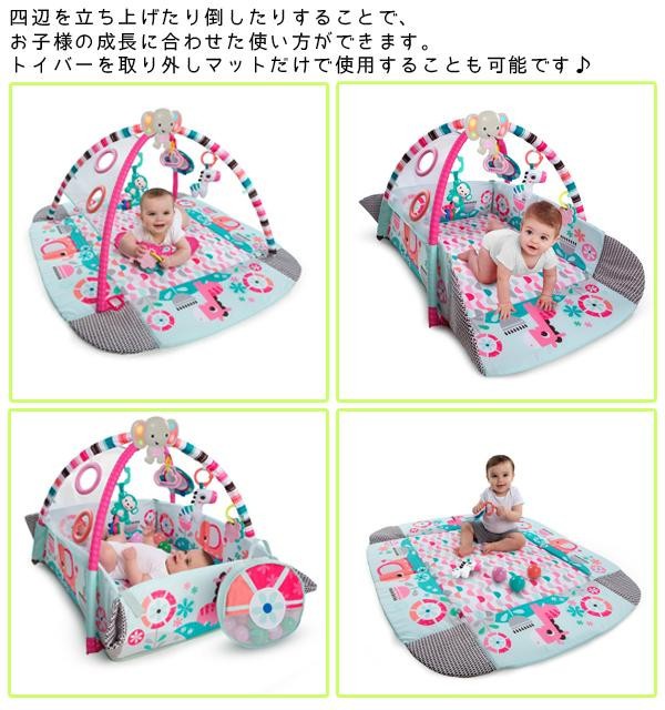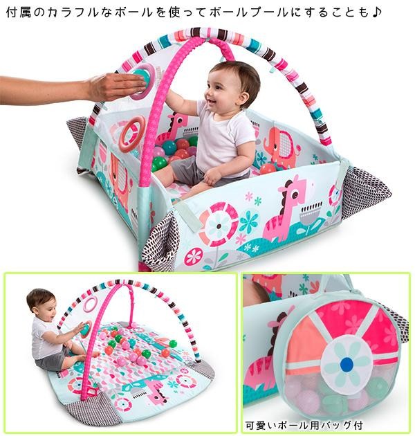 ボールプールとしても使える大きなプレイジム!!マットは遊び方に合わせて自由自在に広げたり、四辺を立ち上げたりすることができます。35個のカラフルなボールや、たくさんのおもちゃに赤ちゃんも大喜び!!赤ちゃんが元気な気持ちになるポップサウンドが流れる機能も搭載しています。ボール用のバッグもついているので持ち運びも可能。 |