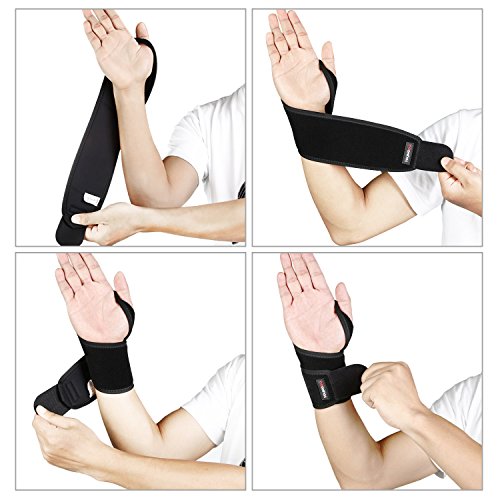 -. Feature : Breathable neoprene fabric conforms to the wrist to provide comfort and support,hook and loop design allows for quick application with easy adjustment. / Thumb hole prevents displacement during vigorous activity, perfect for: basketball, tennis, badminton, etc. / Helps relieve wrist pain, and prevents repetitive motion injuries such as tenosynovitis, commonly associated with computer use. / Durable velcro holds up to more than 200 applications without damage to the fabric. / Specifically designed for left & right hand, perfectly fit for comfortable wearing,one size fits all wrist circumference (5.5" -11").