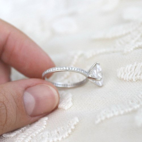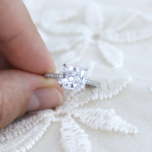 - Feature : This ring is made of sterling silver and is covered with rhodium for anti-tarnish. / Ring stamped 925. Available in size 6, 7, 8 or 9. Central stone measures 8 mm in width, ring's band 2 mm. / Ring is set with diamond-simulated cubic zirconia stones, which shine and sparkle beautifully just like real diamonds. Stones are micro pave set in thin layers of sterling silver, what gives this ring gold-and-diamond look. / Comes with black velvet gift box and free shipping!