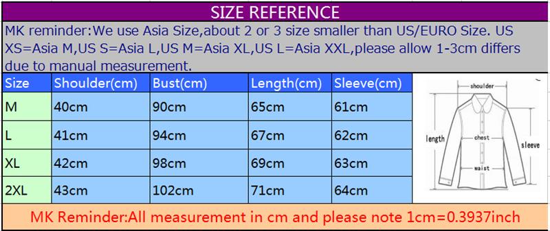 Pls paying attention on shoulder,chest and sleeve length size,if you have any questions can contact online customer service.