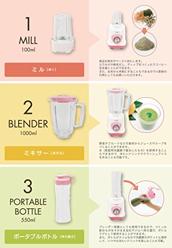 ■귀엽게 이라고 사용하기 쉽다!부수는 혼합하는 운반하는 것「1대 3역할」■드라이,Wet의 양방에 대응한 밀(분쇄)기능.가족용의 대용량 믹서나 퍼스널에게 편리한 포터블 보틀이 하나가 되었다, 쓰기에 편리 함이 편리한3in1블랜더입니다.■8품목 게재의 레시피(요리처리법) 북부.《스무지》나 스프,디《푸》등 간단하게 만들 수 있는 다채로운 레시피(요리처리법)를 8품목을 게재 한 오리지날 레시피(요리처리법) 북 부착.■강약 릴리즈 기능.재료 에 따라 회전 강약이나 릴리즈 운전 전환 를 할 수 있습니다.알기 쉽게 운전 때는LED가 점등합니다.■뚜껑을 한 채로 식재투입 가능.믹서의 뚜껑에 캡이 붙어 있으므로,수나 식재료를 족하고 싶을 때도,뚜껑을 열지 않고 투입에 옵니다.■밀 믹서 포터블 보틀을 사용해 나누고 편리하고 풍부한 식생활.■식품을 분말이나 Paste상에 할 수 있는「밀」위세 걸(걸치)이나 분말 이고,디《푸》나 이유식을 제조하거나 원두커피를 만# 것 를 할 수 있습니다.대용량의「믹서」서는 야채나 후루츠 등의 식재료부터 쥬스나 스프를 만드는 일이 가능.블랜더용기로서도 사용 할 수 있는「포터블 보틀」서는,만든 것을?榴酉洸말楹ぁ≠花?아웃도어에 운반하는 것 를 할 수 있습니다.■특징:3in1 세트/ 강하다/약교환/릴리즈 기능(R위치에 맞추는 간만 운전)/ LED점등/안전 록 기구 부착/오리지날 레시피(요리처리법) 북부/1시간당 전기요금 약9.5엔(1kw/h=27엔)나와 산출.■부속품:밀 용기,보틀 머그,믹서 더《구》,커터/밀 커터.■크기:약W180xD155xH355mm■중량:약1.2kg■전원:AC100V 50/60Hz■소비전력:350W■용량:믹서1000ml보틀 머그550ml밀100ml■모터 회전수:강릴리즈:약22,000rpm/분약:약17,000rpm/분■정격사용 시간:믹서3분 밀1분■전원 코드 길이:약1.5m■재질:본체:ABS 뚜껑:PP 커터:스테인레스 믹서 밀 용기:PS 보틀 머그:폴리에스텔(《고포리에스타》/PCTG)실리콘
