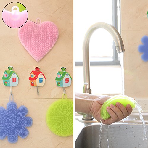 - ✅EASY TO CLEAN AND KEEP DRY: The hanger hole is designed for convenient storage, and “love” has a special design, it can be sucked on the wall. The silicone dish scrubbers can rinse clean fairly well and dry thoroughly, comfortable grip won't slip out of wet hands, they will be good as new when they get clean and dry.