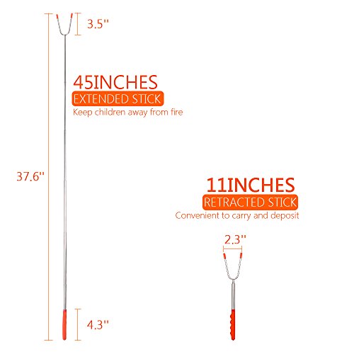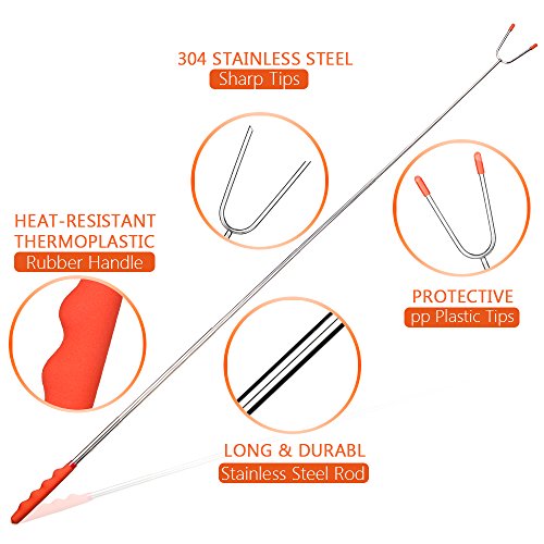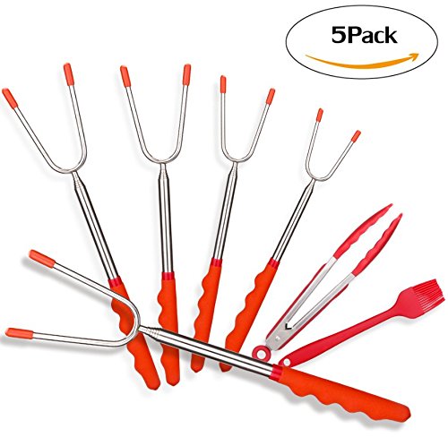 Studio : Bransio Publisher : Bransio Binding : Lawn Patio Product Description If you are looking for the perfect campfire cooking utensils, we are the best choice set of 5 pack roasting forks 1 silicone bbq tong 1 basting brush are enough for a small group to join all themselves in the fun. ?High quality fda approved 304 stainless steel. Bpa free, anti-skidding and heat-resistant rubber handle make us more convenient. Telescopes from 11 inch to 45 inch to keep you and your family safe while having fun. Enjoying a safe and healthy campfire with these non-toxic premium roasting forks. Protective rubber covers for the sharp tips, for perfect storage and safe handling around children. The stick pouch is convenient for camping, picnic, trip or storing at home. Non-stick coating makes it easy to clean after we enjoy the delicious food. Bonus cookware set: 10 inch silicone bbq tong (perfect for grilling to keep your hands away from the heat, great for breakfast, salad and other kitchen use even not barbecuing). 8 inch basting brush (made of flexible heat-resistant silicon, won't melt, warp or shrink like the old brushes, no more hair in your food). Precautions: Please note the weight range of the barbecue fork. The fork tips are sharp, keep your children away from it. Before use, clean the fork first, and then put on the food for barbecue. Package includes: 5* roasting sticks 1* silicone bbq tong 1* basting brush 1* travel bag pouch. The comfortable rubber handle with finger indents gives you a firm, steady grip. ?The two prongs prevent marshmallows from spinning on stick when melting. ?The prongs' sharp tips are protected with rubber, making them perfect for handling around children and making them a must have for any bbq. 0