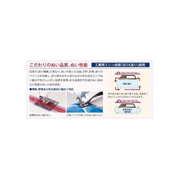 【주요 기능】자동사 컨디션,BOX 보내어 기구,대형 액정 패널,박음질 모양20종류,다이렉트 모양 선택,7매 보내어 이,멈추어 박음질 기능,봉제 스피드900바늘/분,코드 릴식 전원 코드,수납 포켓 첨부 와 하드 케이스