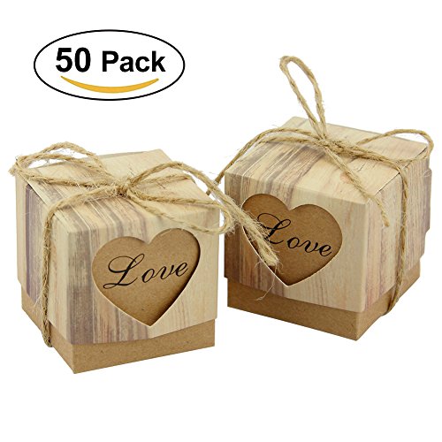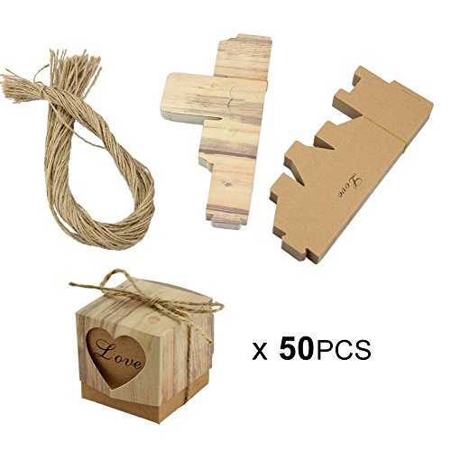 Kbnian 50pcs Candy Favor Boxes,Gift Bags,Vintage Kraft Bonbonniere with Burlap Twine,Love Heart Imitation Bark Gift Box for Wedding Party Birthday Baby Shower Decoration