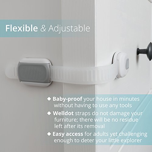 PREMIUM QUALITY: These baby safety straps are sturdy yet flexible. They can be put in place on both flat surfaces and around corners. Welldot safety locks come with extra adhesive so you can conveniently relocate them on other pieces of furniture.