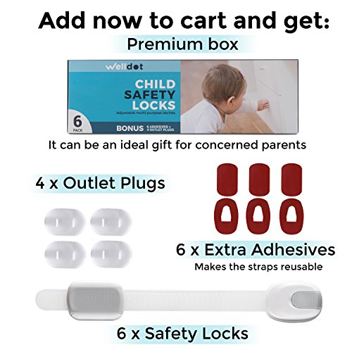 Child Safety Locks Baby Proofing Cabinets | Fridge Lock | Baby Toilet Locks | Reusable Latches for Drawers, Oven Lock, Appliances | No Tools | Outlet Plugs + Extra Strong Adhesives (6 pack) by Welldot