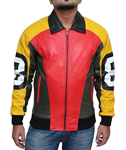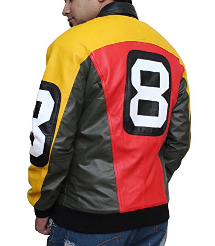 -. Binding : Apparel -. Brand : Decrum -. Department : mens -. Feature : Crafted from the best hide leather quality / Three colors are seen in this jacket, which are red, black and yellow / Outside provides zip slant waist pockets and extra two are made inside / Since it's of a bomber jacket, rib-knit feature are made on the waist line and on the cuffs / It has a shirt style collar and front zip closure has been made as well -. Model : 8475791 -. ProductGroup : Apparel -. ProductTypeName : OUTERWEAR -. Title : Louis Marco Men's 8 Ball Bomber Leather Jacket