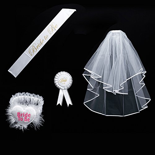 Bride to be Decoration Set for Bachelorette Party Supply(White Double Ribbon Edge Center Cascade Bridal Wedding Veil with Comb,Bride To Be Satin Sash,Rosette Badge and Garter)