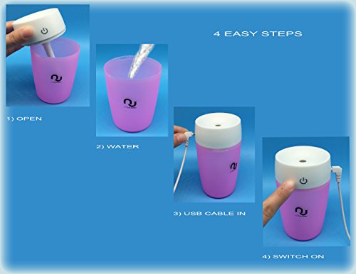 2. Portable Mini Humidifier: comes complete with matching water cup for added stability and keeps water clean from dust and lint .You can also take out and insert the main part into any glass or bottle. 6 hours Auto shut off, compatible with any micro-USB cable, compatible with any water bottle.