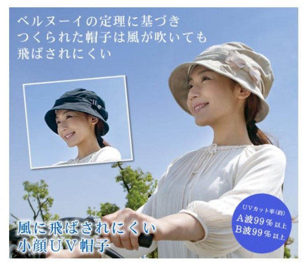 風が通り抜けるUV帽子です。ベルヌーイの定理に基づき作られた帽子はツバとクラウン部分に気圧差が生まれ風が吹いても飛びにくくなっています。
