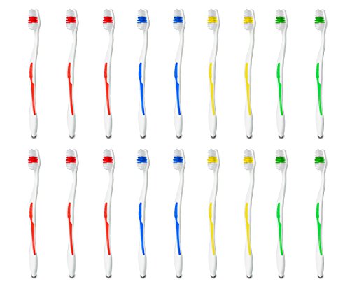 -. Feature : Pack of 100 high quality bulk toothbrushes / Standard Classic style, Individually wrapped / White Color with ( Red, Purple, Yellow, Green, Blue) / Medium Soft Round Filaments Full Head / Ergonomically designed to clean thoroughly between teeth and gums