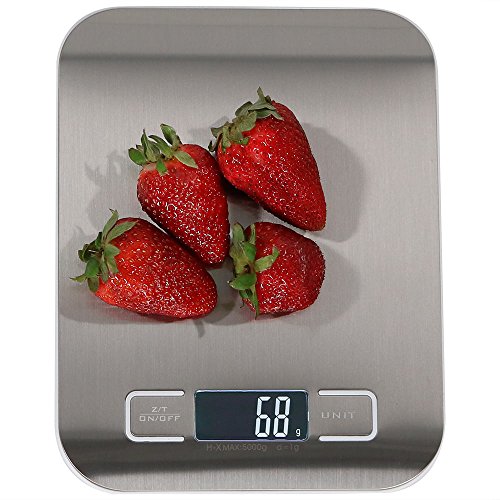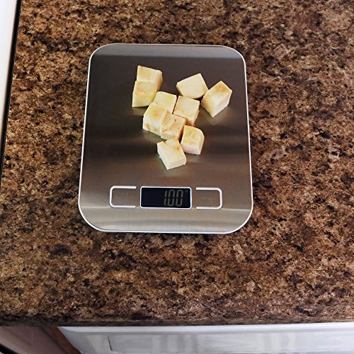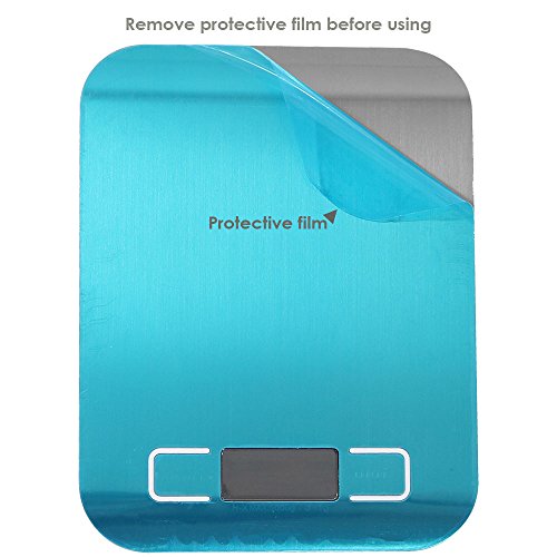 - Sleek easy-clean stainless steel surface with LCD backlit screen makes the scale easy to use. Please note, you need to tear off the TEAL protective film to reveal stainless steel finish. Includes one precise countertop kitchen scale and 2 AAA batteries, so you can weigh your food, meat and baking ingredients with ease.