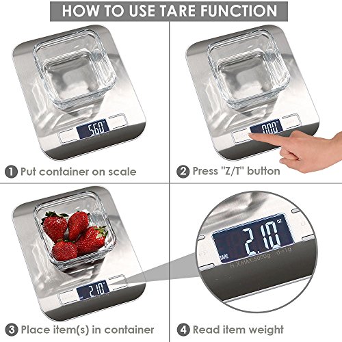 - Tare option allows you to place a bowl on the scale, press the button to zero the scale and weigh your food/ingredients accurately. Each scale also has non-slip rubber feet.