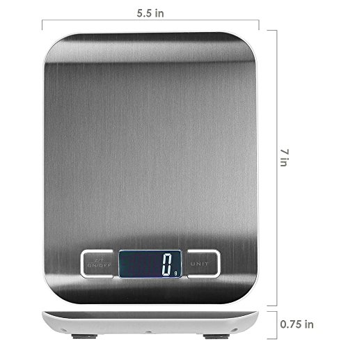- Overall dimensions: 7 inches long x 5.5 inches wide x 0.75 inch tall with a max weight capacity of 5000g (11 pounds), so it is small enough to fit anywhere in the kitchen. Please note that the kitchen scales cannot be submersed in water or put in the dishwasher.