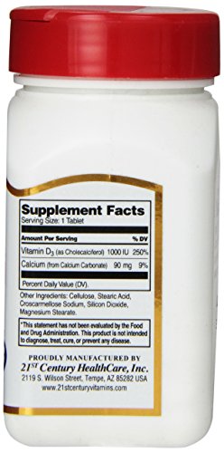 Studio : 21st Century Publisher : 21st Century Binding : Health and Beauty Product Description Vitamin D is essential for absorption of calcium to promote strong bones.* Vitamin D also supports a healthy immune system and breast and colon health.* Unconditionally guaranteed for purity, freshness and label potency. No added Sugar, Yeast, Preservatives, Artificial Flavors or Colors. 21st Century Vitamins and Supplements are manufactured in a cGMP facility under the strictest standards for product quality, including potency and purity. 21st Century prides itself on providing you with a great product at the best value. *This statement has not been evaluated by the Food and Drug Administration. This product is not intended to diagnose, treat, cure, or prevent any disease. 0