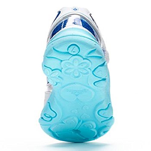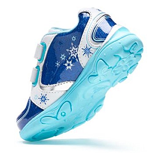 Illuminate her days and nights with these toddler girl's "Frozen" light-up sneakers from Disney. These cute shoes are easy to put on. The glossy synthetic leather upper features an iridescent silver design with pretty blue panels. Anna and Elsa images decorate one side.. A supportive rubber midsole and outsole offer arch and heel support for a comfortable day of play.Feature