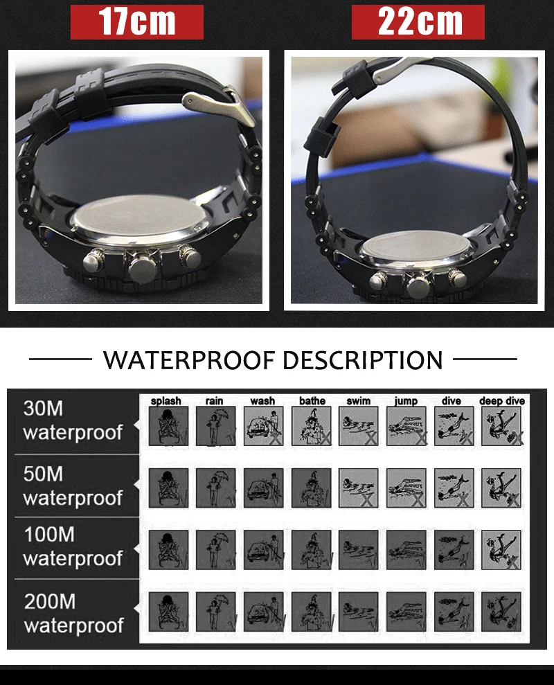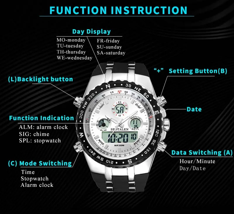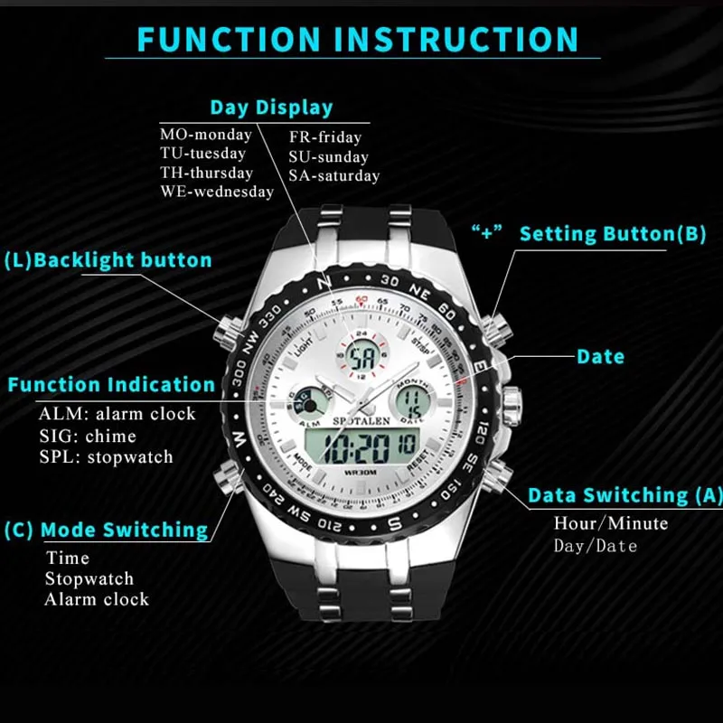 Feature:Complete Calendar,Shock Resistant,Stop Watch,Back Light,Chronograph,LED display,Alarm,Repeater