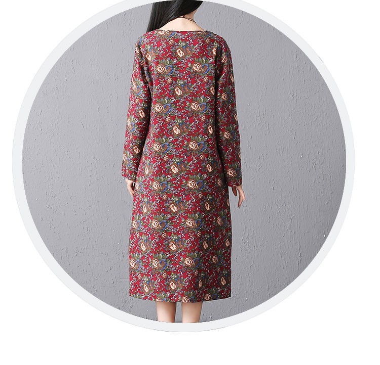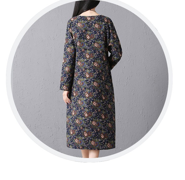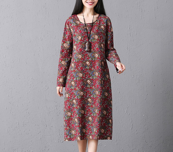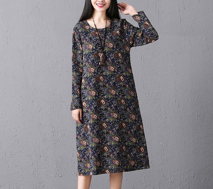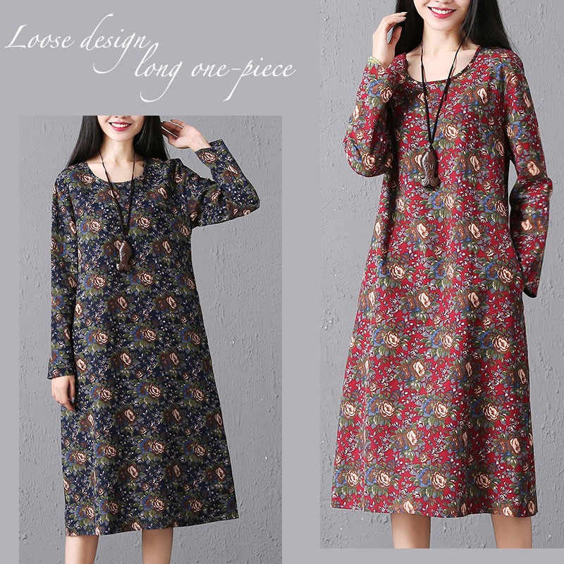 シックでエレガントなローズプリントののロングスリープひざ下丈ワンピース♪