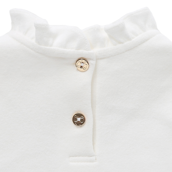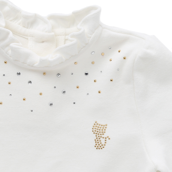 상품설명 블링블링 반짝거리는 골드, 투명 핫피스들이 흩뿌리듯 장식된 심플하고 고급스러운 프릴 TS 입니다. 네크라인과 소매단에 프릴을 달아서 러블리한 분위기를 업시켰습니다. 소장하고 있으면 두루 활용하기 좋은 아이템으로 고급스럽고 센스있는 연출됩니다.