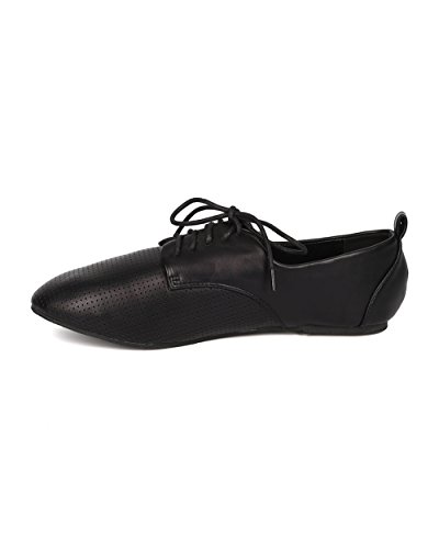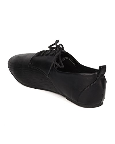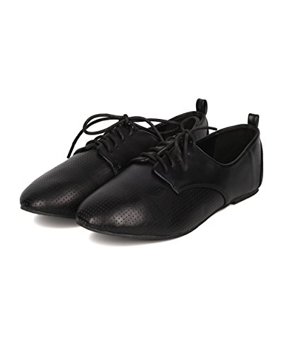 DbDk DK79 Women Leatherette Perforated Round Toe Lace Up Oxford Flat - Black Leatherette