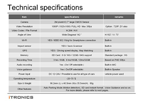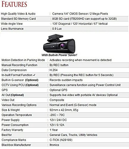 -. Feature : 'ITB-100 SPW + ITB-200L + ITV-80 UPC' 2CH (Front & Rear) Bundle Package / WiFi Access & Wireless interworking with Smartphone with ITB-100SPW / UPC Uninterrupted-Power Cable Included / DC12V ~ 24V / Official English Edition (English Ver. firmware installed, English Manual included)