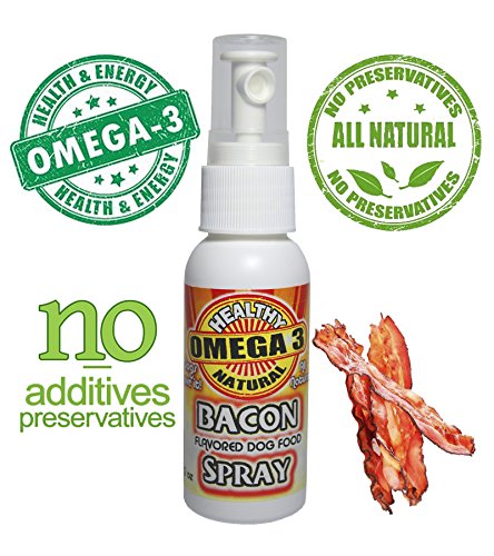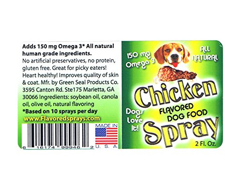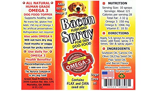 -. Feature : All Natural, no artificial preservatives, dyes, colorants, thickeners or artificial ingredients / Contributes 150 mg of ALA Omega 3 to your dog's daily diet. 150 mg of Omega 3 will make a difference in the quality of your dog's skin and coat. / A proprietary blend of human grade food oils, Olive oil, Canola oil & Soybean oil / Precise control over the application of the dog food topper to the dog food. No mixing of powders and water, No spoonfuls or scoops, just aim and spray. Will not turn dry dog food mushy, low calorie only 13.3 cal per serving, does not need to be refrigerated / Just one 8 ounce bottle will last 3-4 months. Great for the picky eater, use with all types of dogs big and small, puppies too!