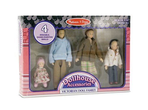 This elegant Victorian-aged family is looking for a happy home! The family includes a mother, father, daughter and baby sister dolls. These beautifully crafted vinyl dolls feature bendable limbs and intricately made clothing. This family will fit perfectly in all 1:12 scale dollhouses, including the Melissa & doug Victorian Dollhouse. (Other items available in the Victorian Dollhouse Collection include: Kitchen, Nursery, Living Room, Bedroom and Bathroom furniture sets.)Feature