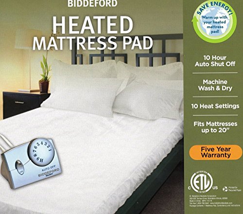 -. Brand : Biddleford -. Color : white -. EAN : 0657812145834 -. Feature : 10 Heat Settings / Machine Wash and Dry / 10 Hours Auto Shut Off / Fits full sized matress: 54 in x 75 in (137 cm x 191 cm) / Includes one controller -. MPN : e3kqx-3549 -. PartNumber : e3kqx-3549 -. ProductGroup : Home -. ProductTypeName : HOME_BED_AND_BATH -. Size : Full -. Title : Biddeford Heated Matress Pad - White (Full) -. UPC : 657812145834