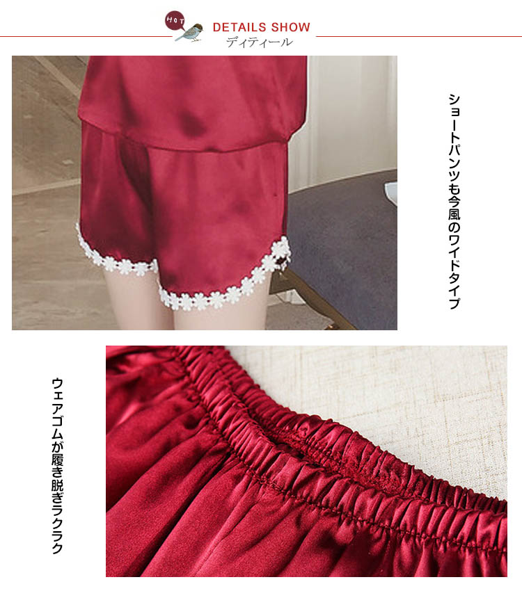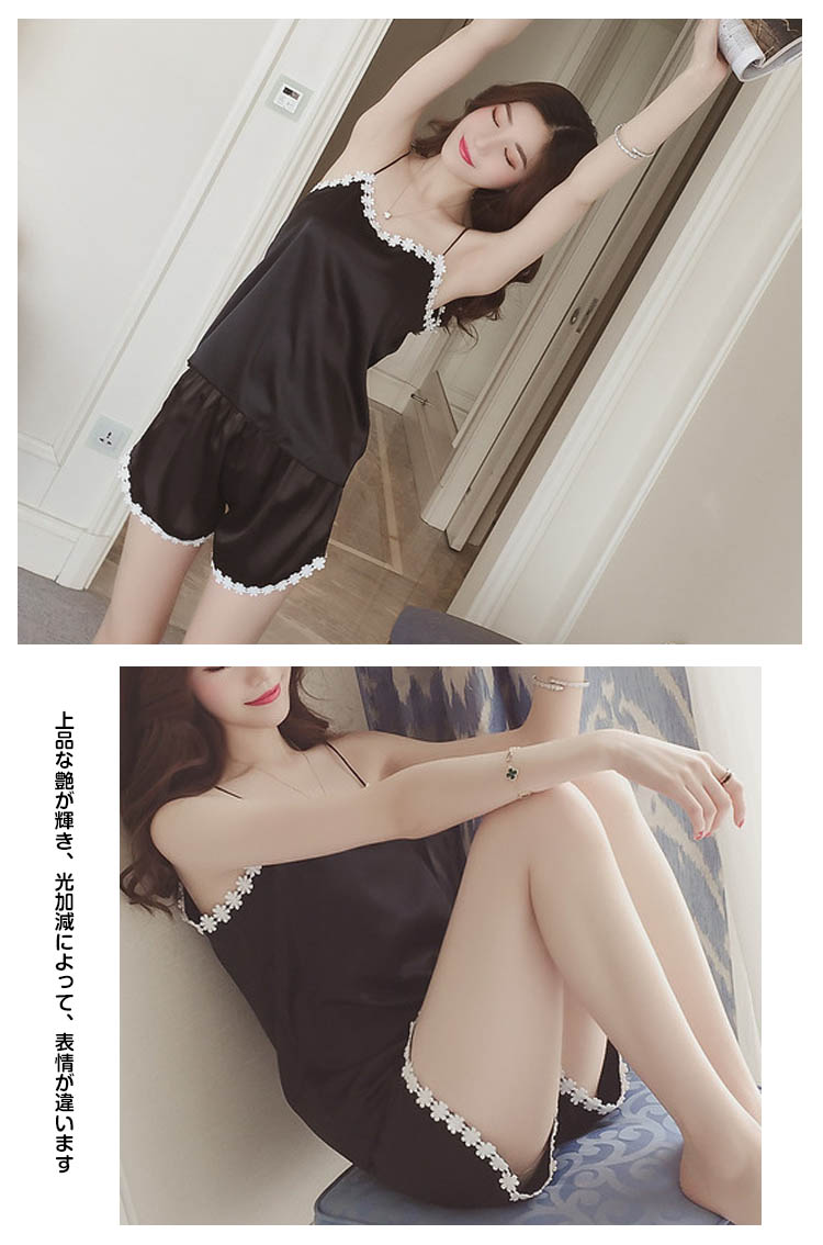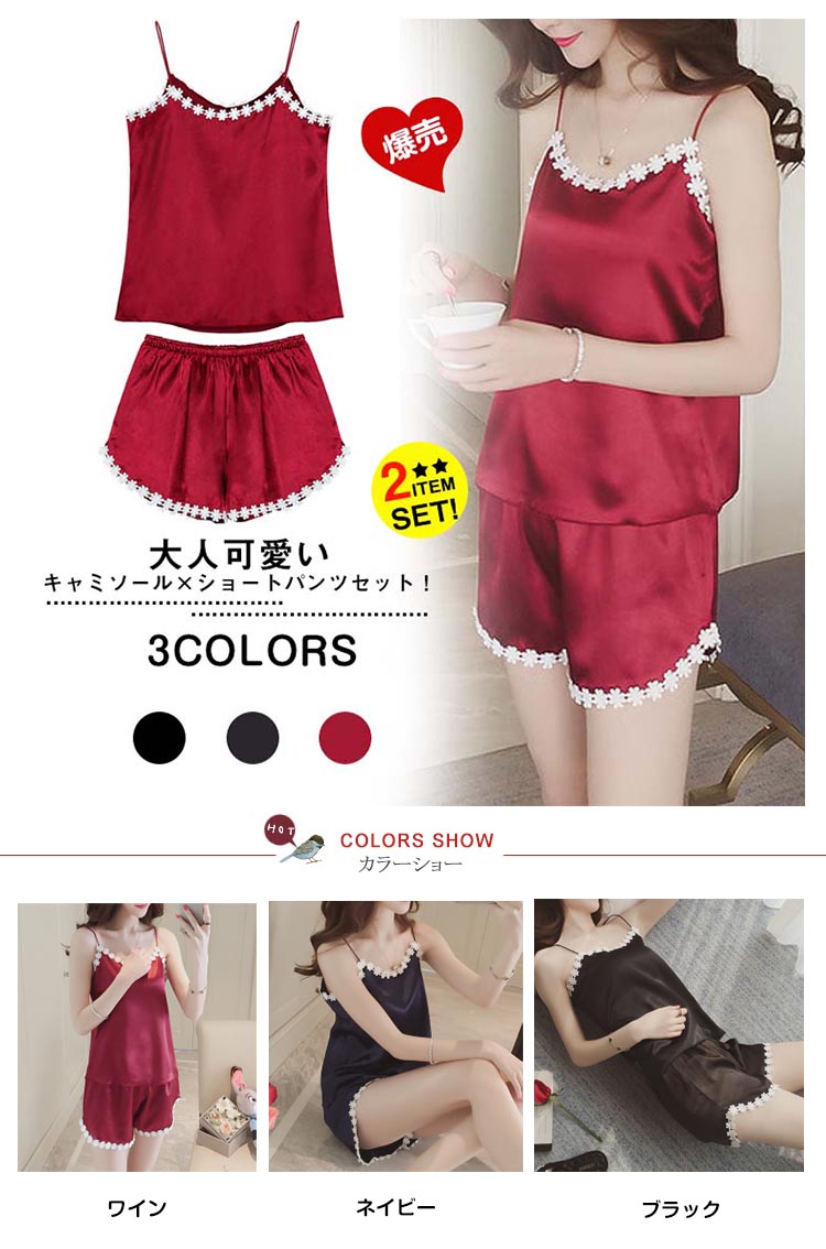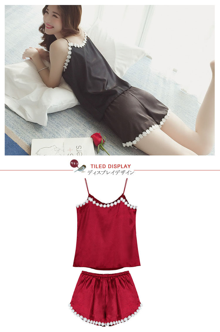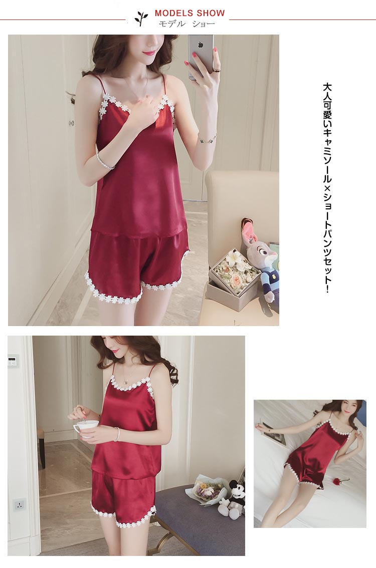 | 大人可愛いキャミソール×ショートパンツセット!セクシーなキャミソールに花モチーフのレースを飾り、SWEET雰囲気に漂う◎サラサラ柔らい上品質素材で家でのお過ごしは快適に◎上品な艶が輝き、光加減によって、表情が違います | |