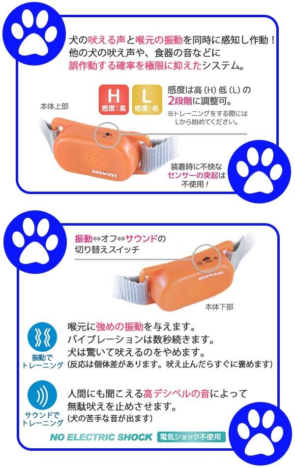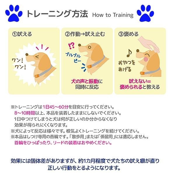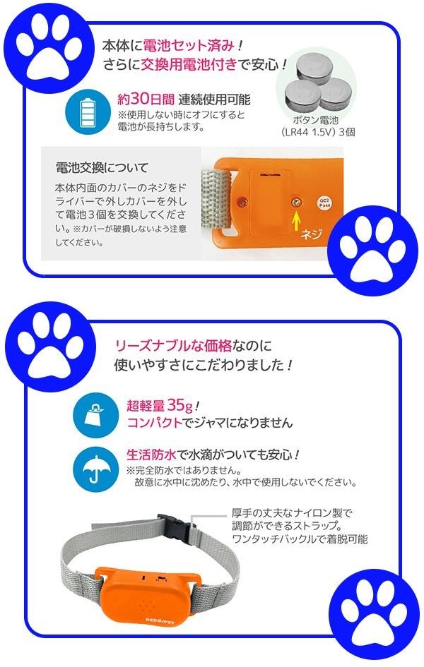 サウンド&振動で安全にムダ吠えのしつけができる首輪です。センサーが鳴き声と喉の振動を感知するとサウンドまたは振動が作動し、ワンちゃんの聴覚・触覚を刺激し、ムダ吠えをやめることを学習します。超軽量&コンパクトでワンちゃんの負担が少ない♪夜のお散歩にも便利なLEDライト付きです。 |