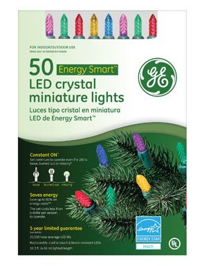 "GE" CRYSTAL MINIATURE LED 50 COUNT LIGHT SET * Multi bulbs. * Green cord. * 6" lead wire. * 4" bulb spacing. * 16.3 lighted length. * Connect up to 25 sets of the same style * Constant-On technology - if a bulb becomes loose, burns out or comes out of the socket the set will remain lit. * Replaceable bulbs (Ace no. 9139338). * Boxed Appears in November 2009 Trim-A-Tree advertising.