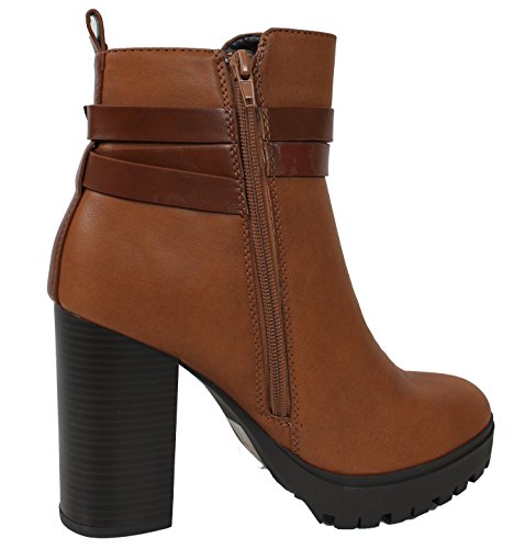 Product DescriptionStrappy ankle bootie featuring round closed toe, faux leather materia, Lug platform 1" and stacked block heel 4" ( Size 7 measurement)0